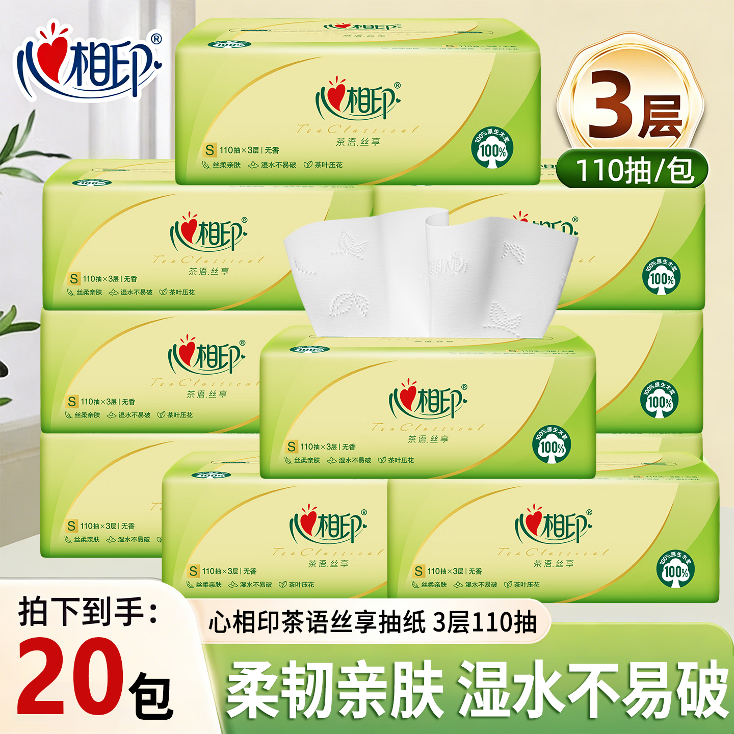 Mind Act Upon Mind心相印茶语丝享系列抽纸3层110抽家用宿舍用餐巾纸无香纸巾卫生纸 【省心装】 3层 110抽*20包