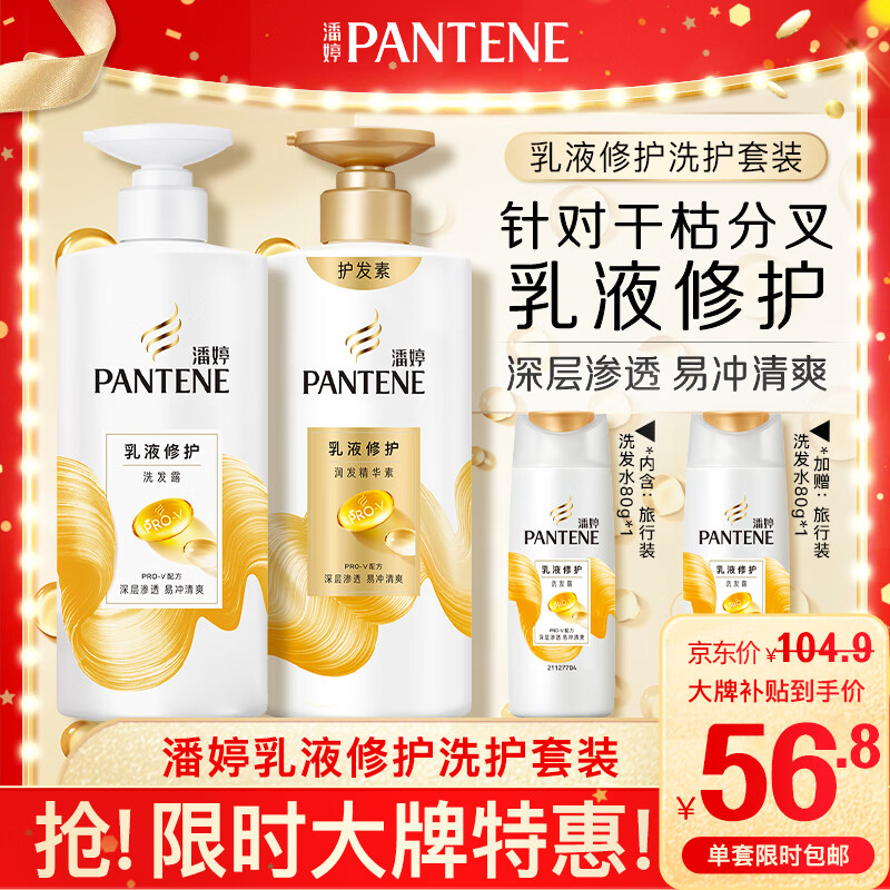 潘婷氨基酸洗发水丝质顺滑洗500g+护500g+洗80g柔顺蓬松洗头膏
